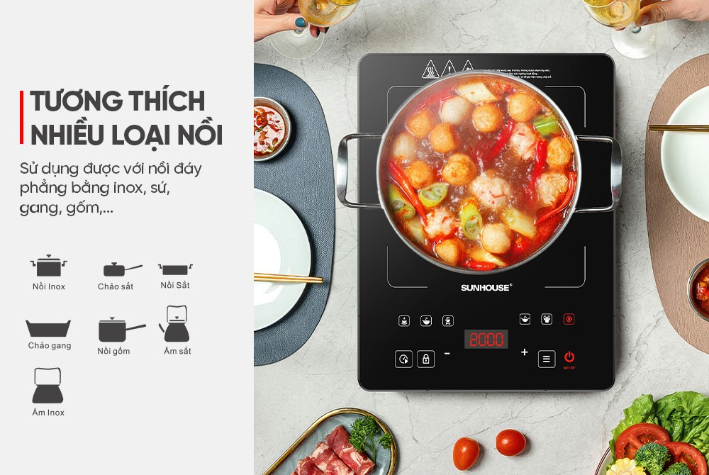 Bếp hồng ngoại cảm ứng Sunhouse SHD6006A tương thích với nhiều loại nồi khác nhau như inox, sắt, gang, gốm,... mang đến sự tiện lợi tối đa khi nấu nướng. Để đạt hiệu quả gia nhiệt nhanh, bạn nên sử dụng nồi, chảo có mặt đáy phẳng, tiếp xúc tốt với bề mặt bếp.